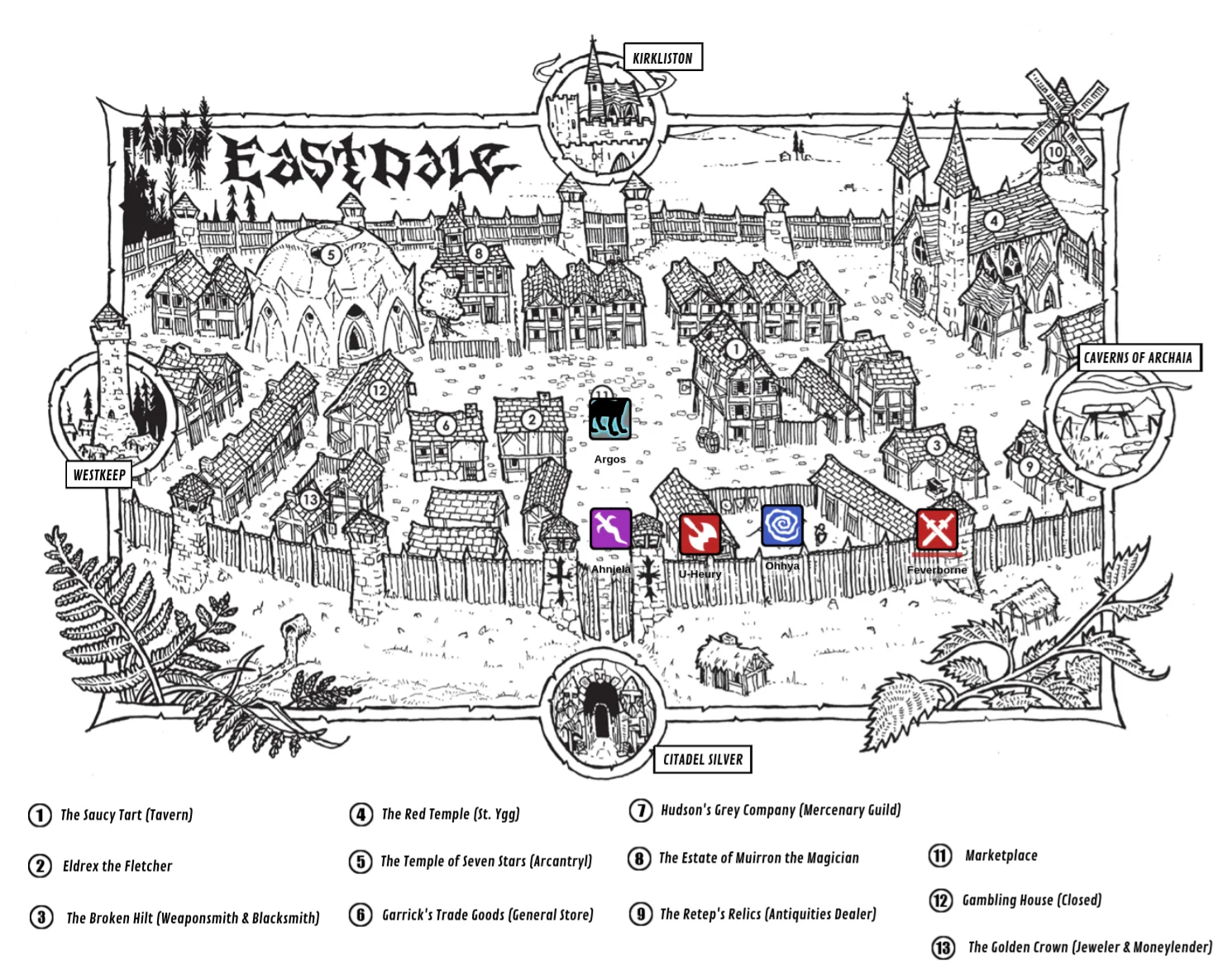 A medium-sized town surrounded by threats and run by St Ygg. There are many oppressive laws, including forbidding strong drink save during the dinner hour and banning fluorescent mushrooms in the marketplace.