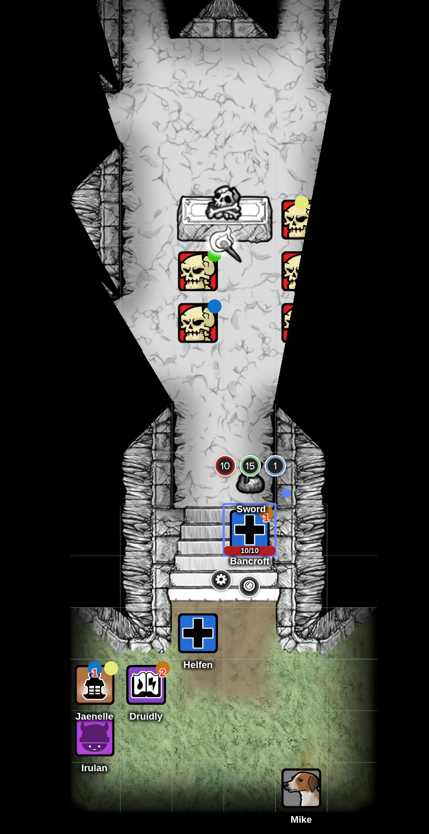 The situation looked grim: four undead remained in the barrow and Bancroft stood between them and the entrance. If he could hold, Helfen could join and lend prayers to turn the remaining skeletons, but there would be no one else to take their blows. Bancroft tossed away his original sword and drew the jeweled one, planting his feet on the stairs and preparing to make his stand.