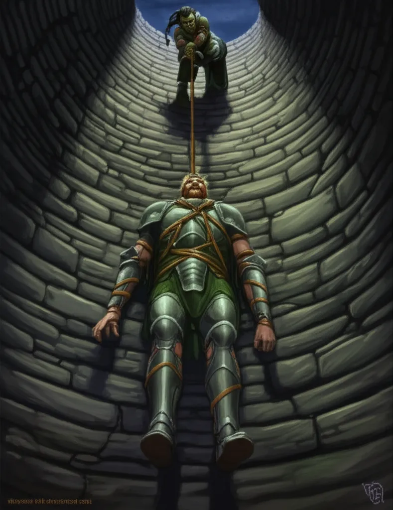 Irulan hauls Bancroft up the rope shaft, his armor slack and arms hanging, Bancroft going up like cargo