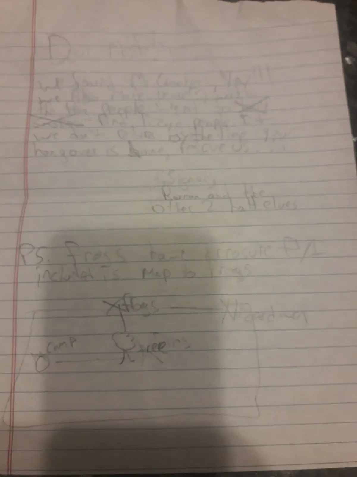 As we left the party, they had just survived an attack by a coordinated warband of bullywogs (frog-men) by the skin of their teeth. Michael healed Leah, Barron, and Kevin so the three party members could follow the escaping bullywog and hopefully catch it before it could warn any others. The rest of the party made camp, and woke up the next morning with a note pinned to one of their backpacks.